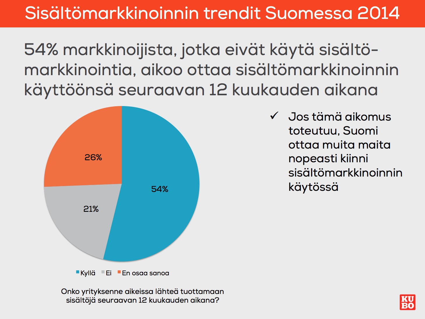 Mikäli tämä aikomus toteutuu, Suomessa yritykset ottavat muuta maailmaa tulevan vuoden aikana kiinni sisältömarkkinoinnin käytössä. Aiomme tehdä vastaavan Sisältömarkkinoinnin trendit 2014 -kyselytutkimuksen myös ensi vuonna, jolloin on todella mielenkiintoista nähdä miten aikomuksista on tullut tekoja.