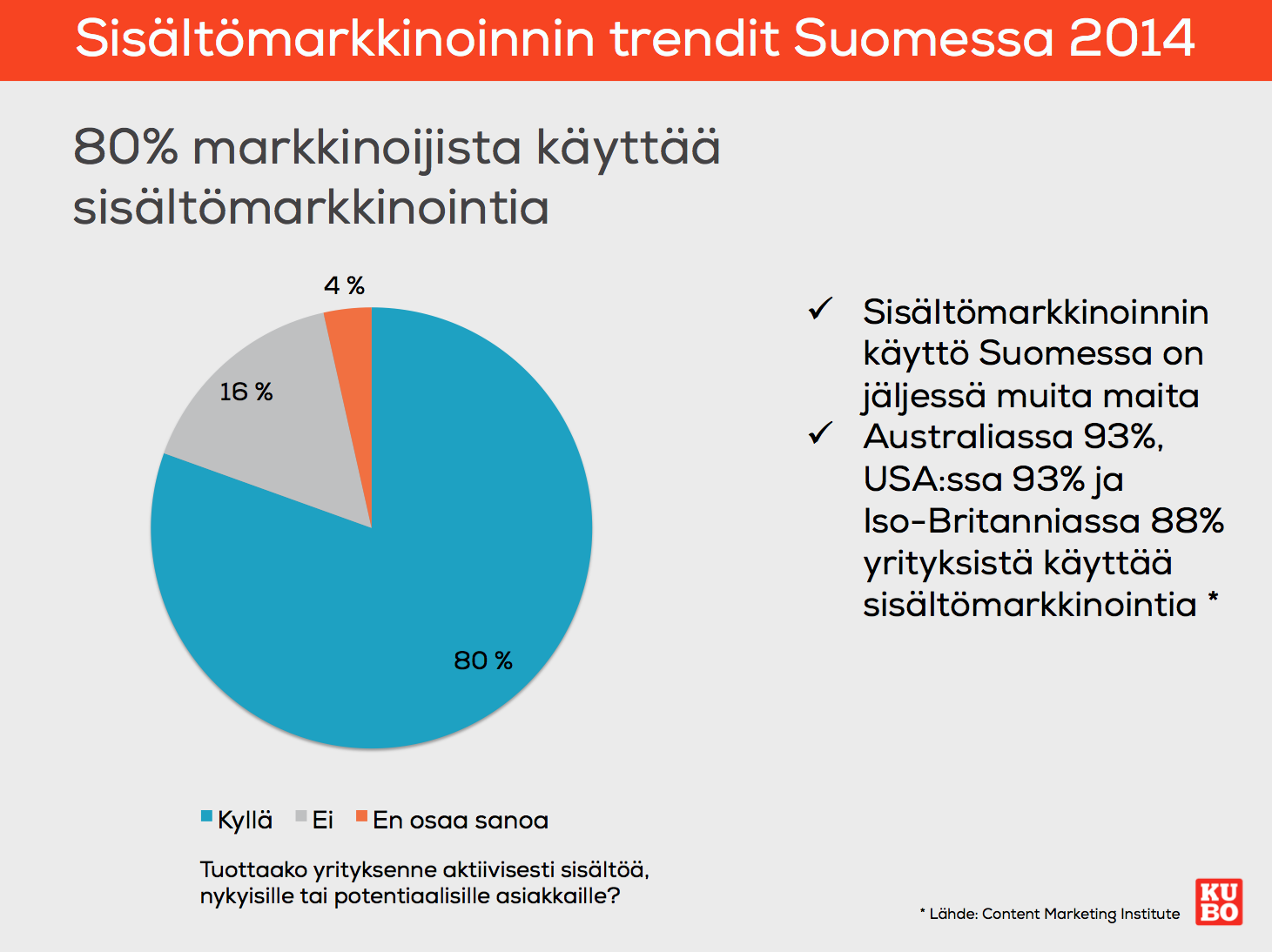 Kyselymme perusteella sisältömarkkinoinnin hyödyntäminen on suomalaisissa yrityksissä muita maita jäljessä. Suomessa 80 prosenttia markkinoijista hyödyntää sisältömarkkinointia. Content Marketing Instituten tekemien tutkimusten mukaan Australiassa ja Pohjois-Amerikassa 93 prosenttia yrityksistä ja Iso-Britanniassa 88 prosenttia yrityksistä hyödyntää sisältömarkkinointia. Selvästi enemmän kuin Suomessa.