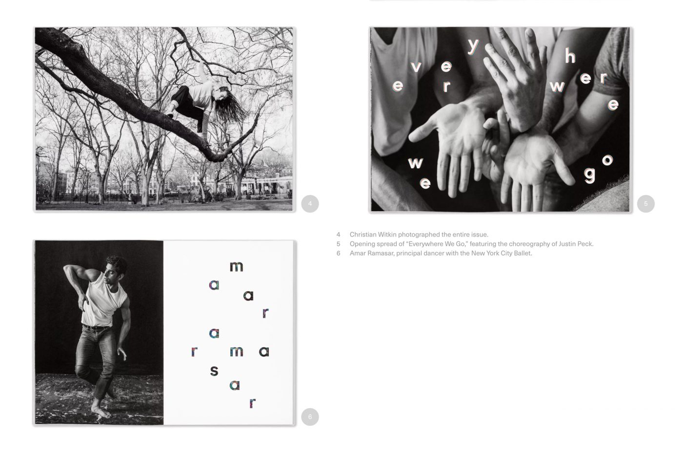 Dance Ink -lehdellä on selkeä idea; se antaa tilan tanssille. Tanssi näkyy visuaalisessa rytmissä typografian ja tanssijoiden kautta. Lue lisää lehden suunnittelusta täältä.