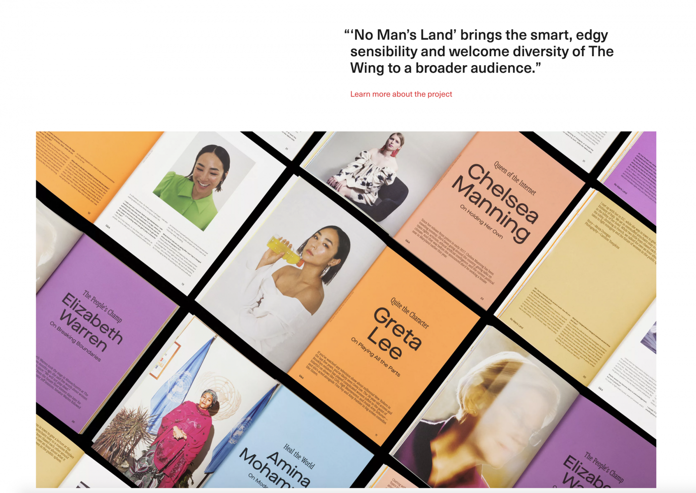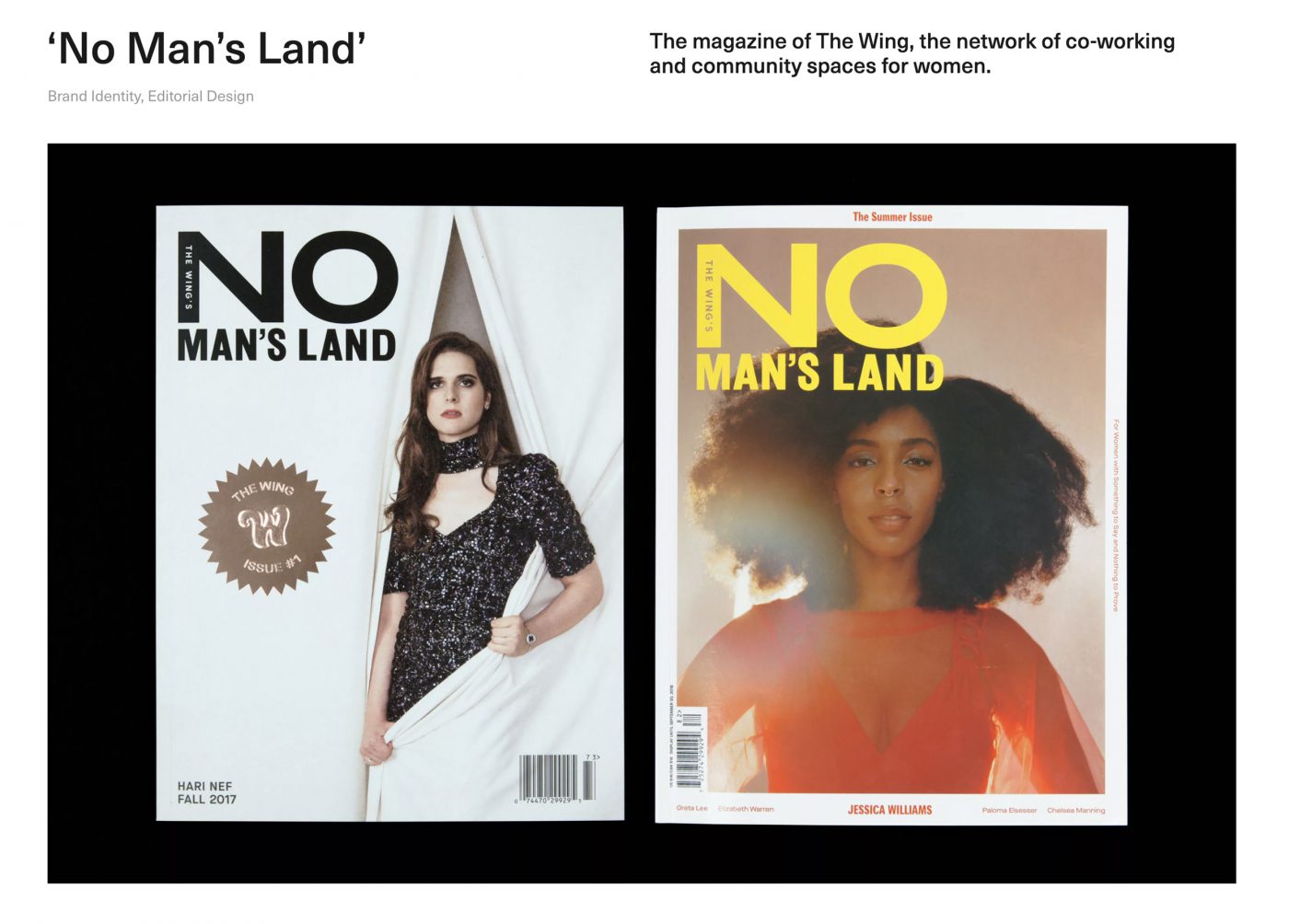 Naisille tarkoitettu, yhteisöllisten coworking-tilojen verkosto, The Wing julkaisee yhteisönsä näköistä lehteä No Man’s Land. Tyylikäs lehti on kaikenlaisille naisille suunnattu ja naisten tekemä. Moniäänistä viestiä tukee myös valokuvat ja koko visuaalinen ilme. Lehdessä käytetään vaihtelevia ja voimakkaita värejä. Se leikittelee visuaalisella rytmillä ja typografialla. Lehden slogan on “The magazine for women with something to say and nothing to prove”.